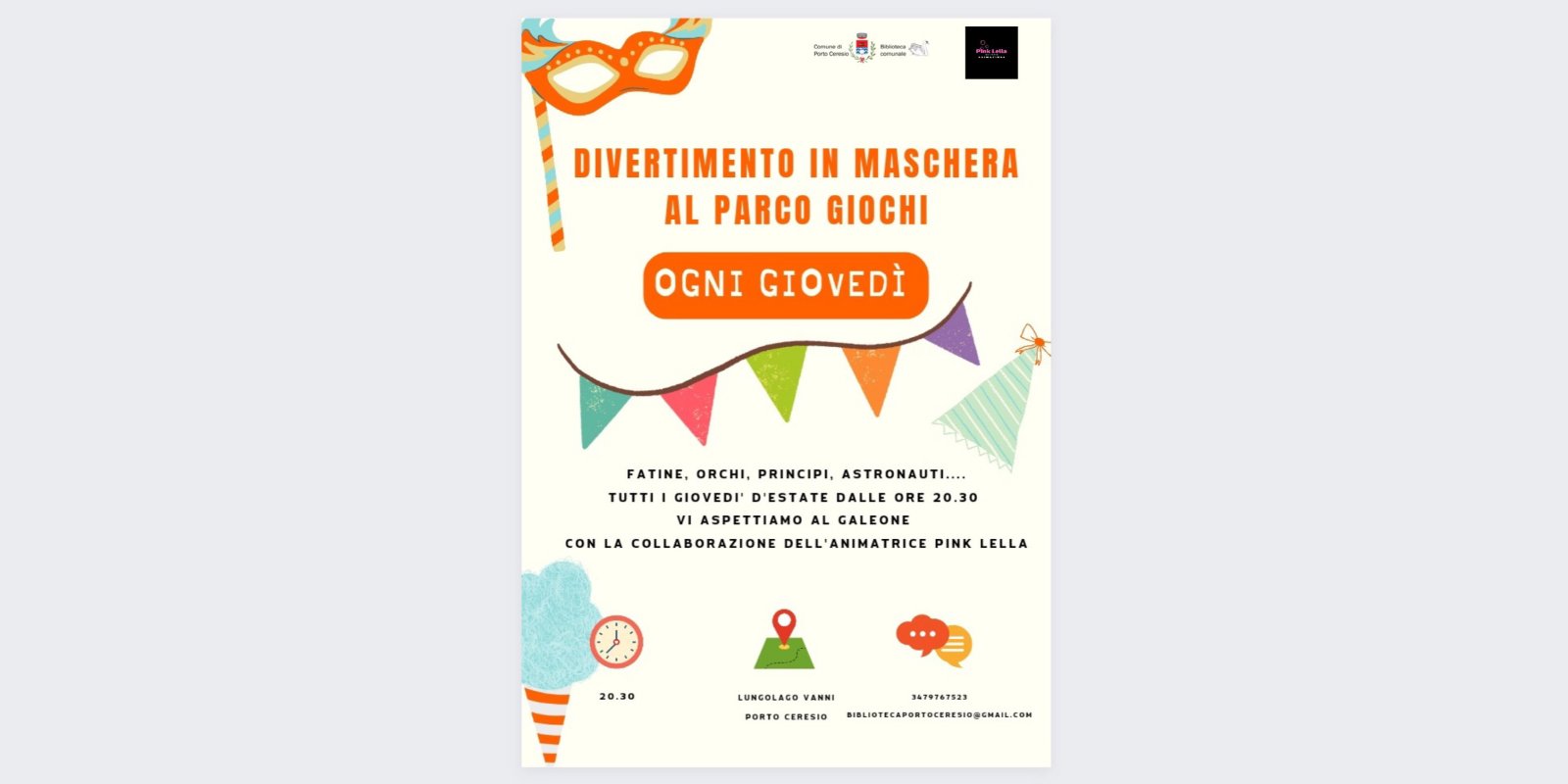 Divertimento in maschera al parco giochi Lungo lago vanni Porto Ceresio, Porto Ceresio, Varese, ItalyDivertimento in maschera al parco giochi ogni giovedì. Fatine, orchi, principi astronauti... tutti i giovedì d'estate dalle ore 20.30 vi aspettiamo al galeone con la collaborazione dell'animatrice pink lella.